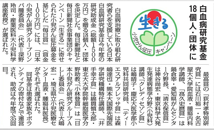 小児領域特別研究賞である毎日賞(小児がん征圧募金)は、産業医科大学